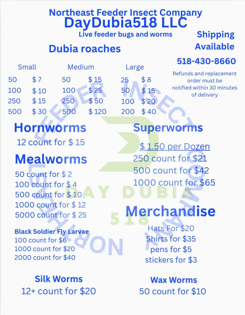 Day Dubia 518 was founded with a simple mission: provide clean, healthy, and dependable feeder insects for reptile keepers, breeders, and backyard poultry owners. We specialize in high-quality live feeders that help animals grow strong, stay active, and maintain proper nutrition.